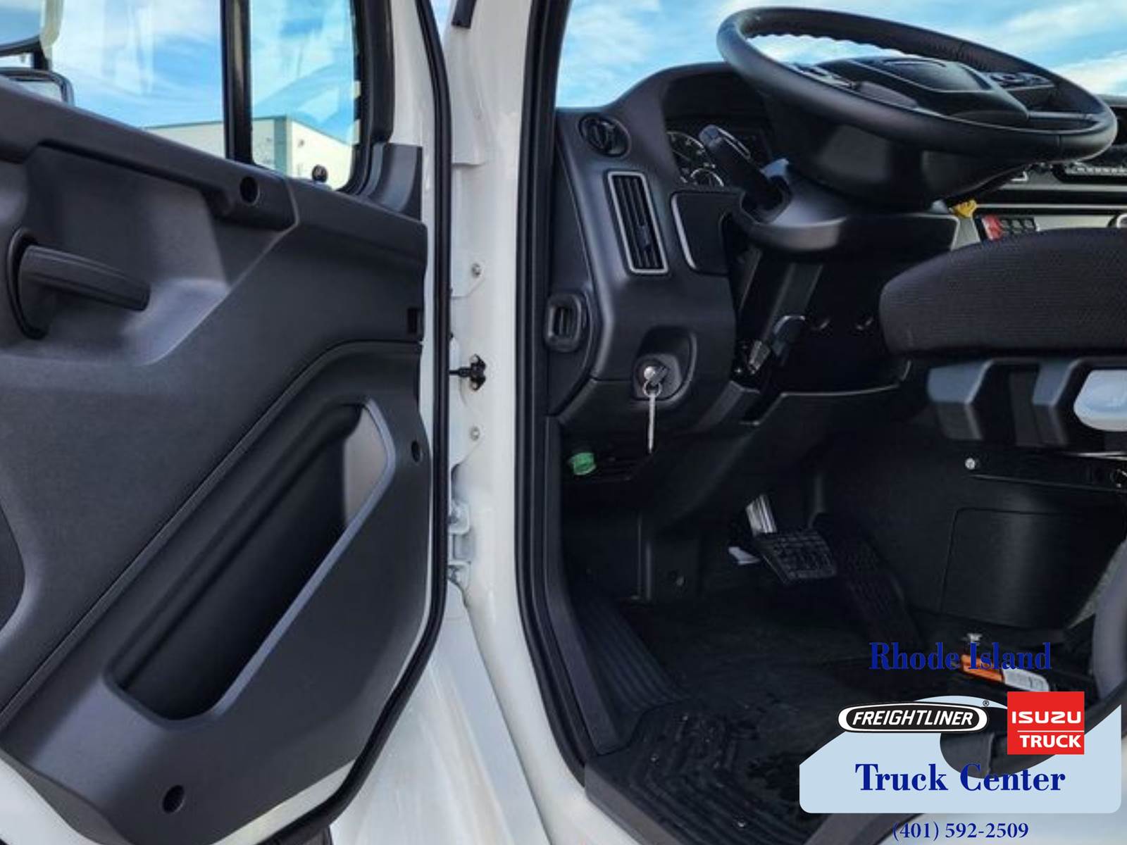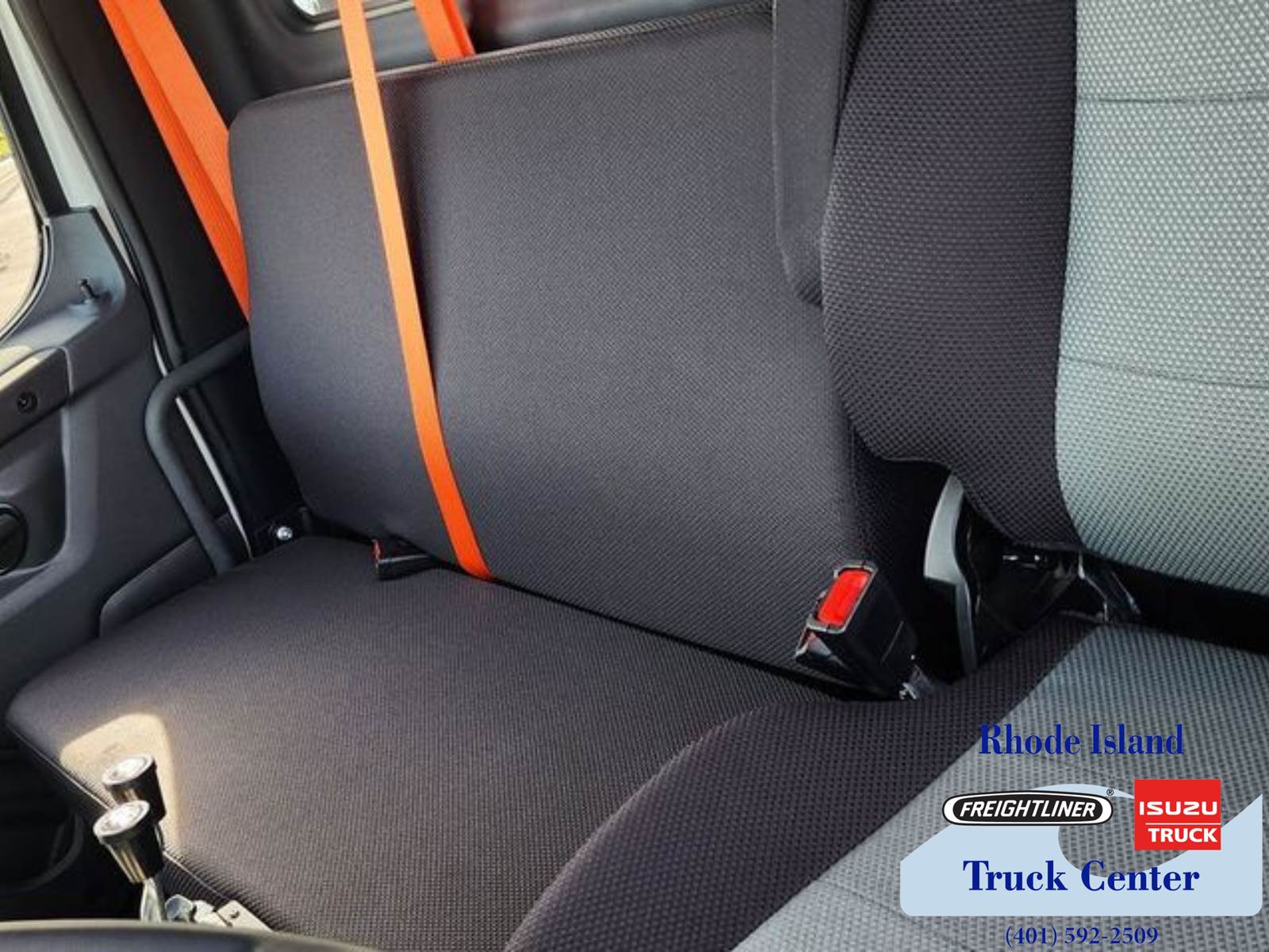 Exterior is white. Interior features rugged black cloth seats with gray and carbon vinyl trim. Seating for three with a high back air ride driver seat and a two man toolbox mid back passenger seat.