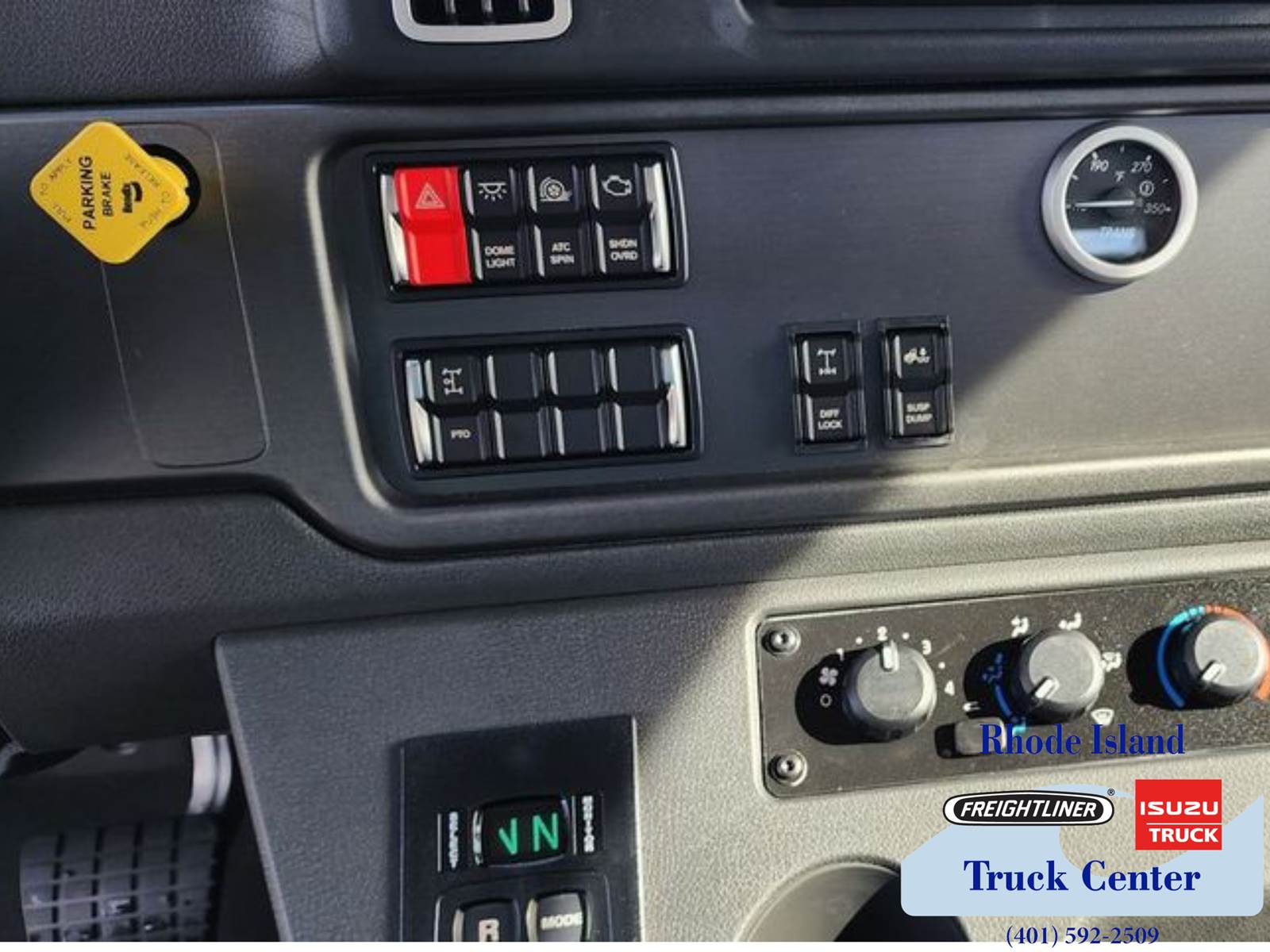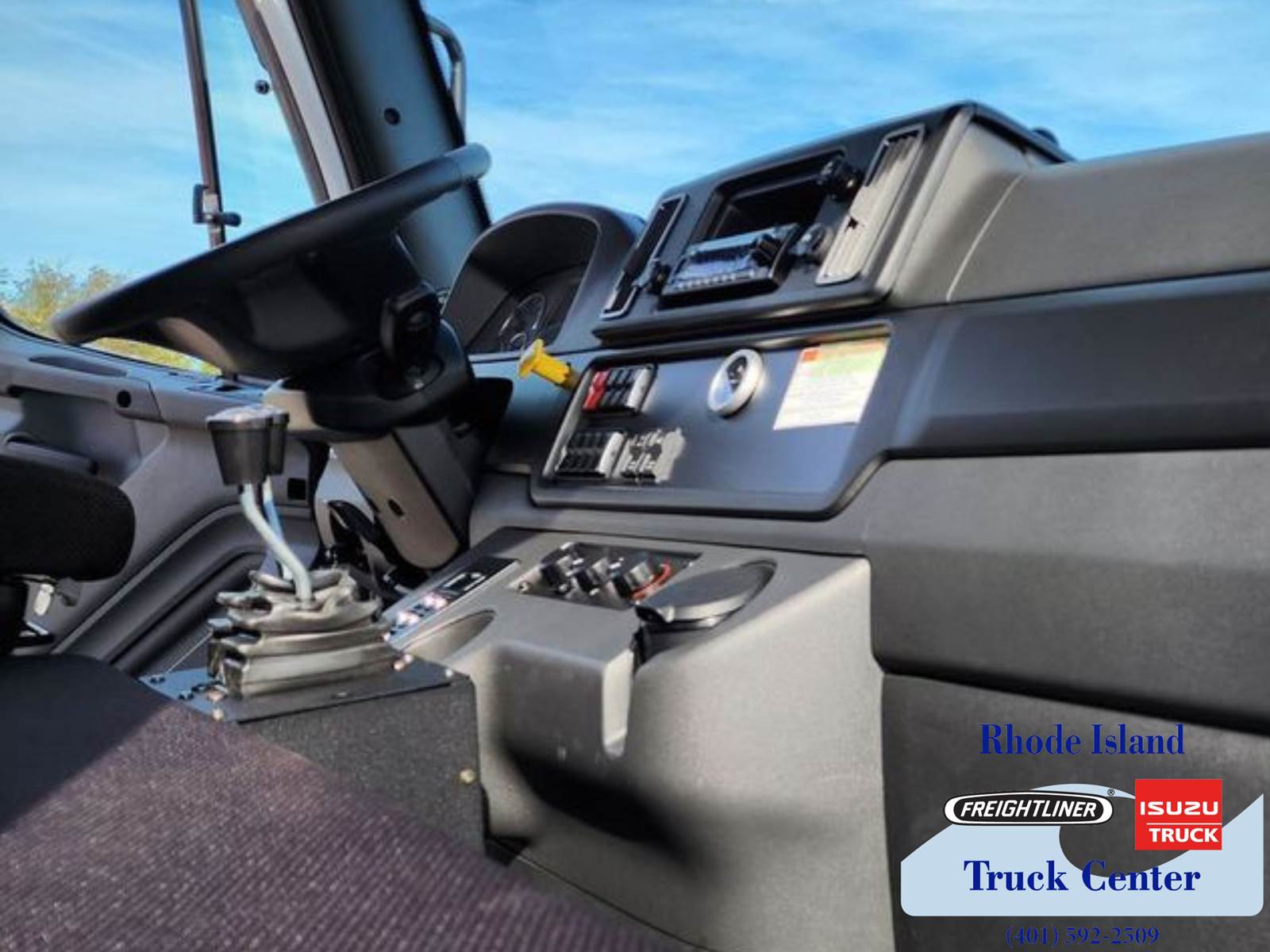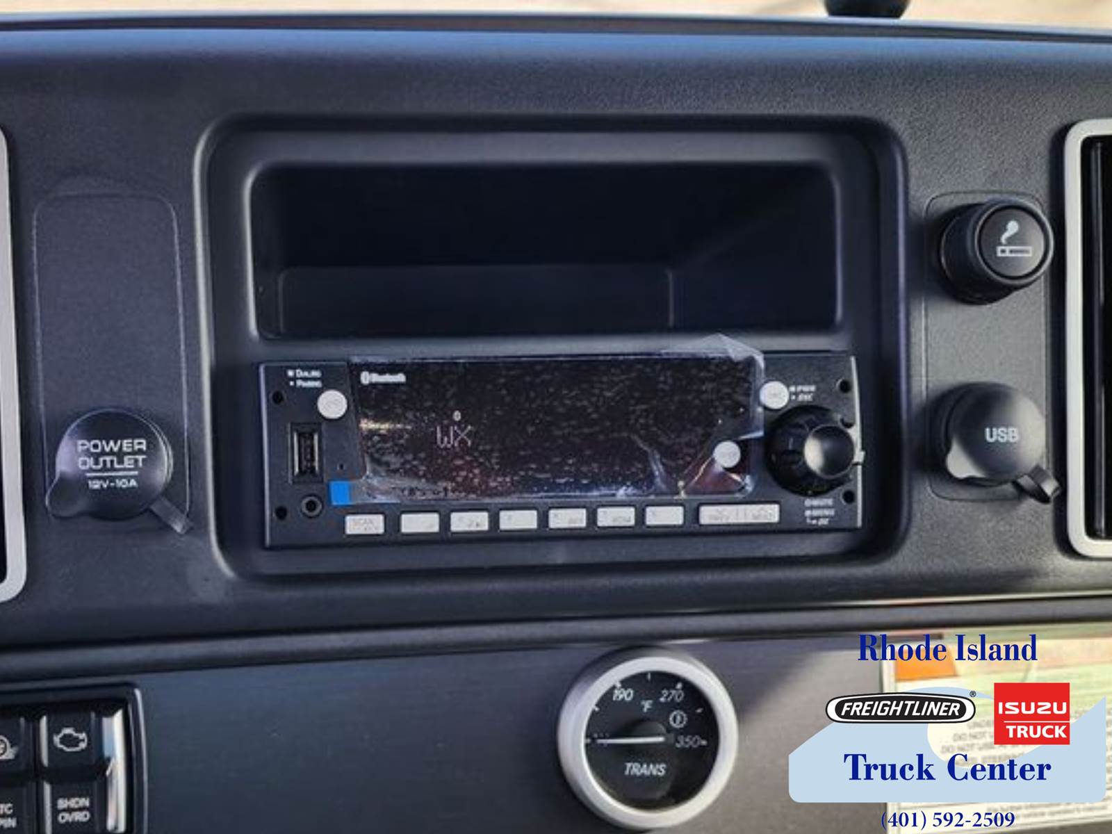Technology features include an electric digital dash, AM FM WB radio with Bluetooth USB and AUX inputs, driver and passenger speakers, HVAC with air conditioning heat and defroster, and a 12V outlet. Additional equipment includes WABCO 4S 4M ABS with traction control, engine remote interface, air cab mounting, power windows, and heated power mirrors.
