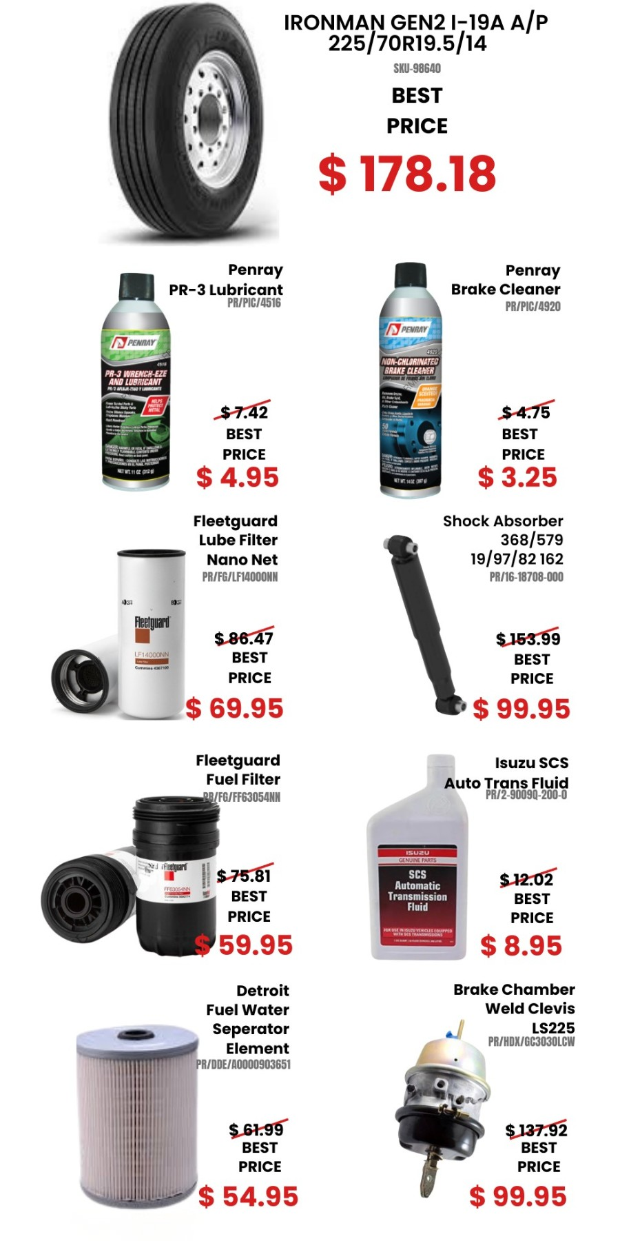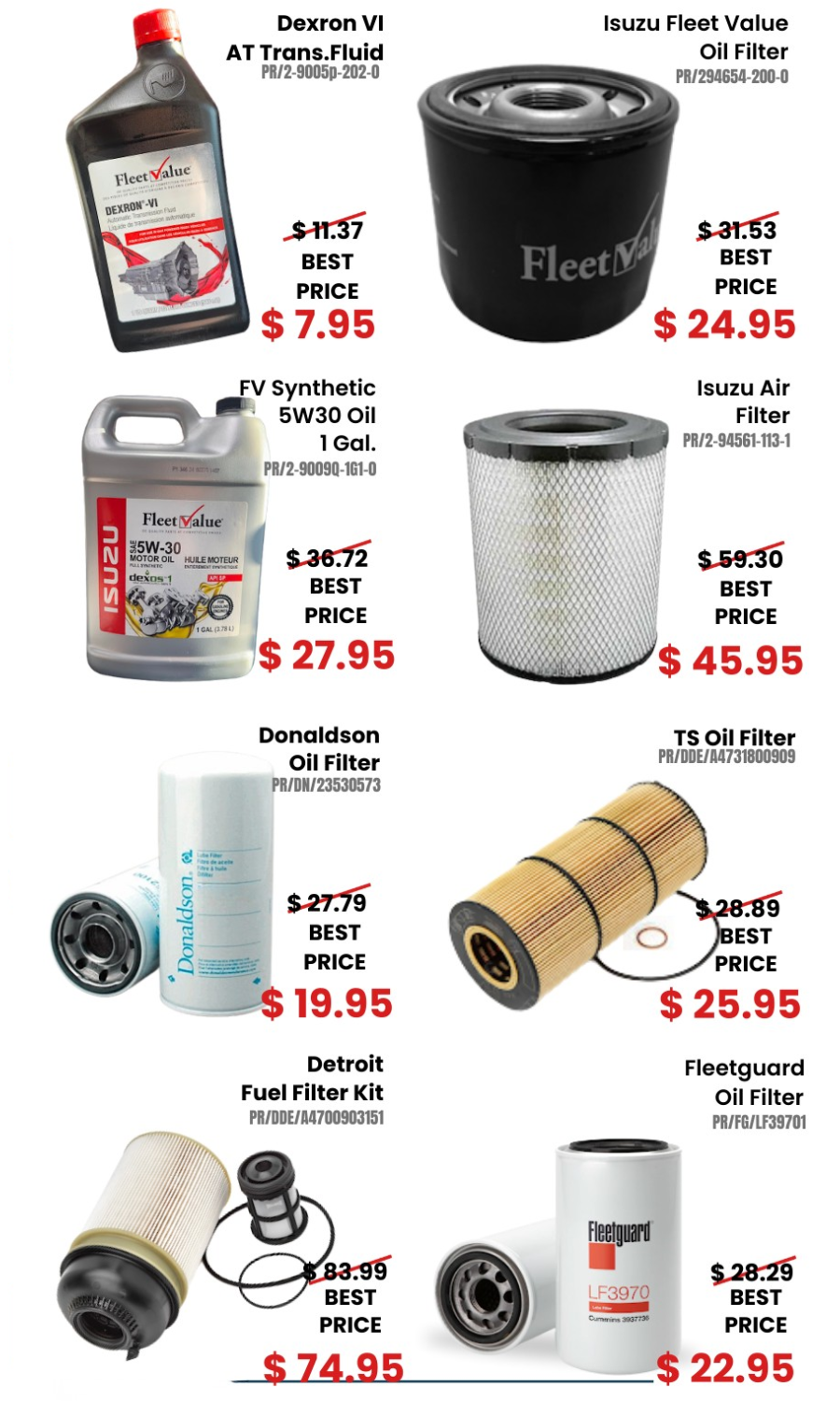 ABP/N53-0069 14OZ NONCHLORINATED BRAKECLEANER 10 VOC DN/23521528 FUEL FILTER ELEMENT MBL/23512741 OIL, DDC GENUINE 15W-40, CK-4 5-GAL PAIL ABP/N42A1657VB DRUM - 16.5X7 VALUE BALANCED DDE/A0000903651 ELEMENT, FUEL WATER SEPARATOR 23-09114-000 WASHER-0.69X1.31X.177,YLW ZN,STEEL,HRDN FG/LF3970 ELEMENT-OIL FILTER MBL/23512703 OIL,DDC GENUINE 15W-40,CK-4 1-GAL (4/CS) ABP/DEF-002T12 ABP DSL EXHAUST FLUID 2.5 GAL TOTE US 12 DDE/A0000140002 COLLAR SCREW W/DECOUPLING ELEMENT 23-12485-250 CLAMP-CONSTANT TORQUE,HOSE,2 9/16-3 1/2 DDE/A0049941645 SPRING NUT, DPF COVER 23-09114-003 WASHER-FLAT,STEEL,HARDENED,1/2 IN OWI/23519396 COOLANT DDC PWRCOL ELC OAT 50/50 (6/1CS) 30042-94654-200-0 OIL FILTER DDE/N910143006001 SCREW, M6X16 23-13833-110 NUT-HEX,PT,5/8-11,GR C,ZN/AL 23-13833-112 NUT-HEX,LOCKING,3/4-10,GR8,ZN AL 2-9009Q-1G1-0 FV SYN OIL 5W30 2-9005P-202-0 DEXRON VI ATF SKF/47691XT SEAL-OIL XTR R 1.051 1 6.308 PHM/8-43147 TIE STRAP-14.5IN,BLACK,NYLON,50 ,100/BAG 23-00461-007 NUT-7/8 14,HI,HEX G8 23-09114-005 WASHER-FLAT,STEEL,HARDENED,7/8 IN 23-09114-002 WASHER-FLAT,STEEL,HARDENED,3/8 IN DDE/A4720160169 MOUNTING BOLT, CYLINDER HEAD CHR/35058XT SCOTSEAL X-TREME DN/P610260 ELEMENT-AIR FILTER,PRIMARY 8-94474-923-0 BOLT;BRK,DISC T 9-47165-096-0 CUP;SHOE HOLD8-94248-117-1 SEAL; OIL, FRT DDE/08929357 BOLT FG/FF5776 FUEL FILTER OKA/WNM2227TIXY NUT-FLANGE,M22-1.5,1.06,33MM RAI/R61709 ELEMENT-FUEL FILTER,7MIC